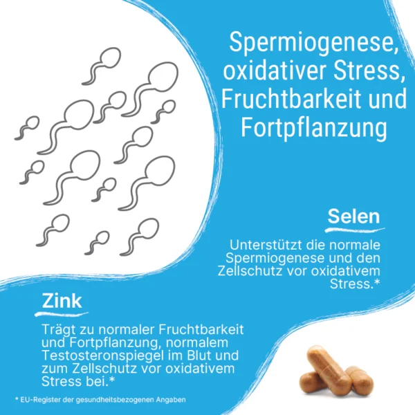 Selen trägt zu einer normalen Spermatogenese (Spermienproduktion) bei und schützt die Zellen vor oxidativem Stress. Es unterstützt die normale Spermatogenese und den Schutz der Zellen vor oxidativem Stress. Darüber hinaus fordert es die Erhaltung normaler Haare und Nägel.