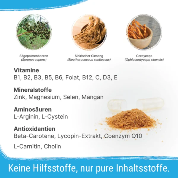 - Inhaltsstoffe im Fertil+ Männer die zum Energiestoffwechsel für die Fortpflanzung beitragen