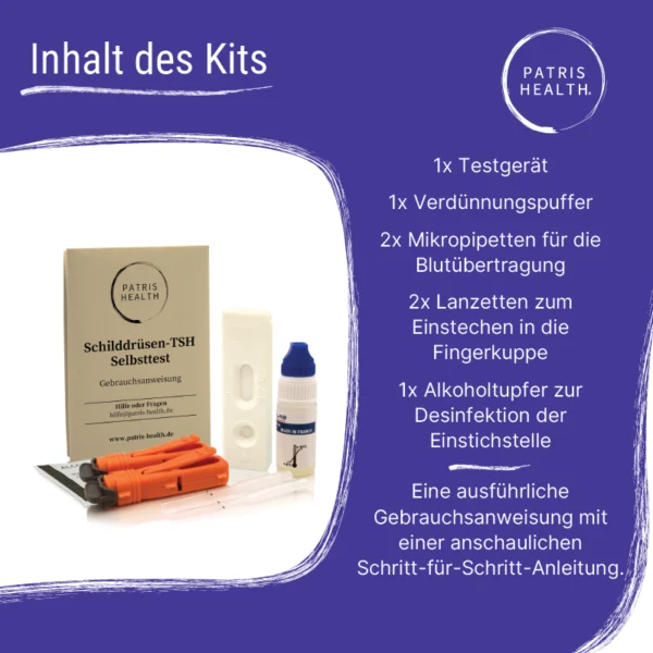 Das Patris Health® Schilddrüsen-TSH Selbsttest-Testkit enthält: