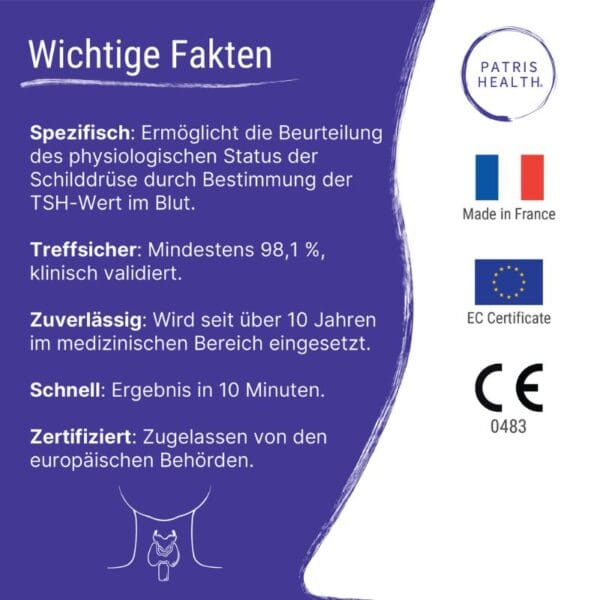 Der Patris Health® Schilddrüsen-TSH-Selbsttest (Schilddrüsenunterfunktion) ist eine wertvolle Hilfe bei der Überwachung der Schilddrüsengesundheit. Erhöhte TSH-Konzentration im Blut zeigt eine Unterfunktion der Schilddrüse. Sie können selbst zu Hause überprüfen, ob Ihr TSH-Wert erhöht ist.