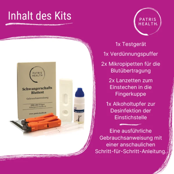 Patris Health® Schwangerschafts-Bluttest – Inhalt des Kits mit Testgerät, Lanzetten und Puffer